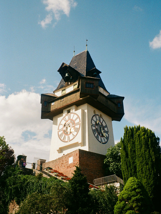 A traditional stone archway in Rabat; the Uhrturm (clock tower) on the Schlossberg hill in Graz (Elina Verheles/Unsplash)