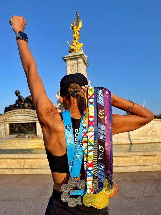 Adele Roberts after running the 2025 TCS London Marathon to complete the Six Stars challenge; having finished the Chicago Marathon, Roberts heads to the New York event with British Airways in 2024. Opening image: Roberts with her fifth medal after the TCS New York City Marathon