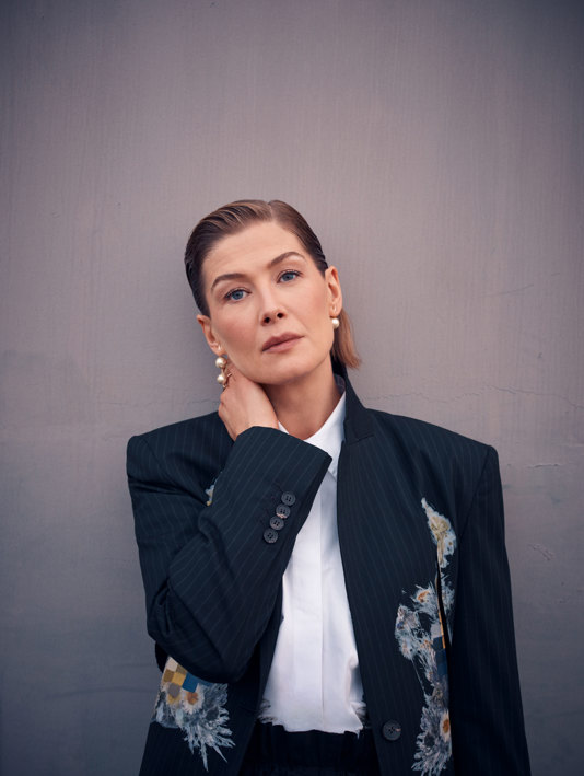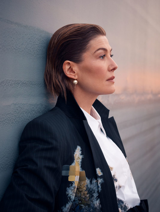 Her partner and children speak Mandarin, so the family enjoy a trip to China once a year and their fascination with the country and culture has led to her exec-producing hit sci-fi show Three Body Problem, based on the book trilogy by Cixin Liu. But she bemoans that she’s still not fluent in the language herself. “I understand a lot just by osmosis. I started learning. But then when you get busy on one of these films, there is no time for anything.” The family are now settled back in London (with the Citroën) where Pike’s next challenge awaits, returning to the stage in Inter Alia, the new play from Prima Facie playwright Suzie Miller. It’s the first time the actor has done theatre since her 2010 tour of Hedda Gabler and the first she has originated since Hitchcock Blonde in 2003. “There’s a tremendous thrill in being the one to create a role for the first time,” she says. “And I’m about to embark on my research… you go to a very humble place where you realise you know nothing at all, and it’s all the specificity of the real people that brings the world to life.”