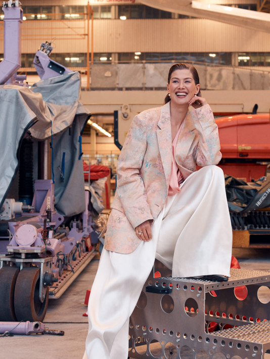 Rosamund Pike looks thoroughly at ease as she stands on the wing of an Airbus A350 in BA’s cavernous engineering hangar at London Heathrow. Though she’s more than 50 feet off the floor and harnessed – in a Marques’Almeida floral jumpsuit with Dior sneakers and jewels – she seems unfazed. Perhaps that’s the composure that runs through many of her performances (she was the ultimate ‘cool girl’ in David Fincher’s Gone Girl, after all), but also because, as she later confesses over afternoon tea, she’s an “aviation nerd”, who has visited the Boeing factory on her holidays and toured the Concorde Alpha Delta G-BOAD at the Intrepid Museum. And this is not the first time she’s balanced on the wing of a plane. “Breitling has a vintage biplane,” she recalls as she forks a cake. “I went up to a thousand feet strapped on to the wing, but I did it in a 1920s aviation costume with plus-four trousers. Turns out that wasn’t very practical – it was all flapping about!”
