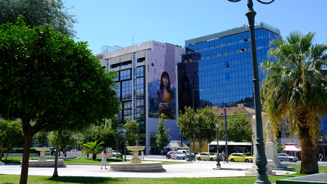 Giant mural on the side of the Piraeus Bank building (Rebecca Naylor)