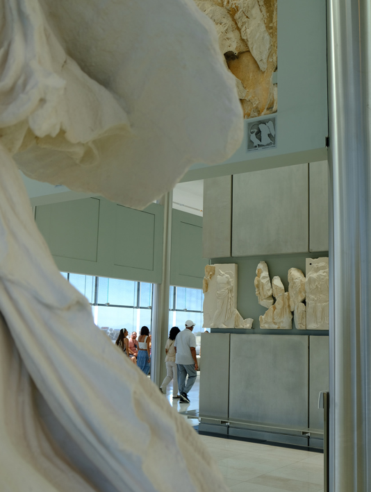 Ancient Greek sculptures in the Acropolis Museum; Little Tree Books and Coffee (Rebecca Naylor)