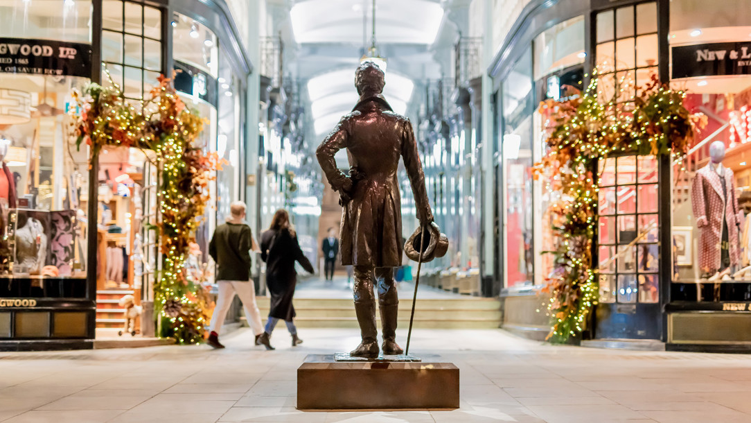 A statue of Beau Brummell surveys the intersection of Jermyn Street and Piccadilly Arcade. Opening image: Regent Street at Christmas