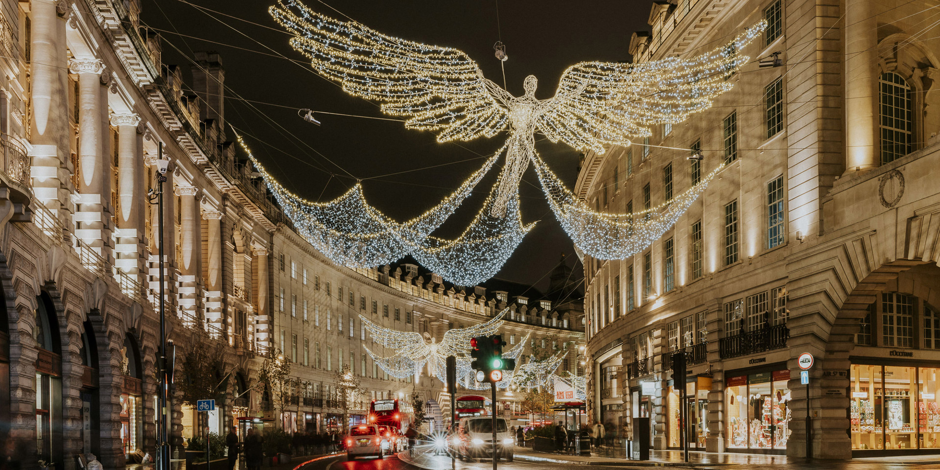 This British craftsmanship, timeless tailoring and fabulous style are echoed by the Christmas light display of angel figures in beautiful, billowing robes soaring above the streets.