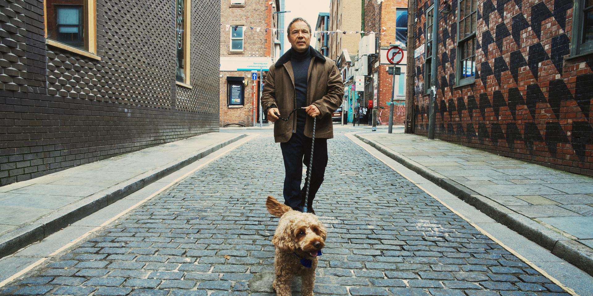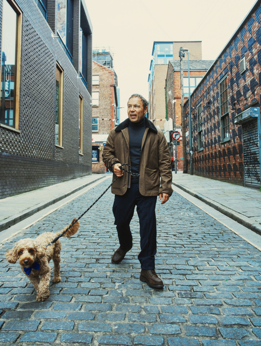 Left: Graham wears Oliver Spencer Lambeth Barwell canvas jacket, £379; Mr P at Mr Porter tapered wool drawstring trousers, £175; Grenson ‘Donald’ brown grained leather with rubber sole boots, £360. Charlie the dog, Chief Happiness Officer at The Halyard Liverpool, Vignette Collection, wears his own coat. Right: Connolly regular collar single cuff shirt, £395