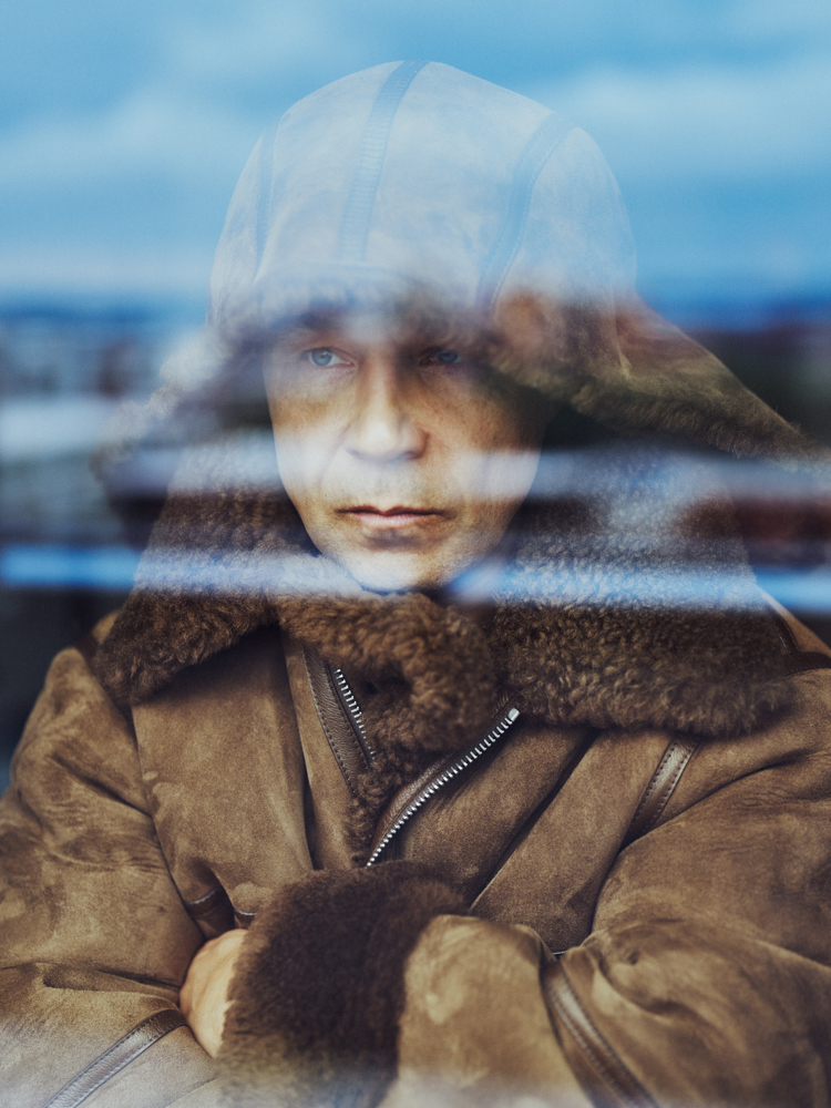 Stephen Graham wears Mackintosh Weir dark navy wool duffle coat, £995; Stone Island mock neck double knitted sweater in white virgin wool, £605