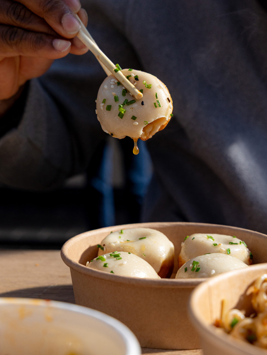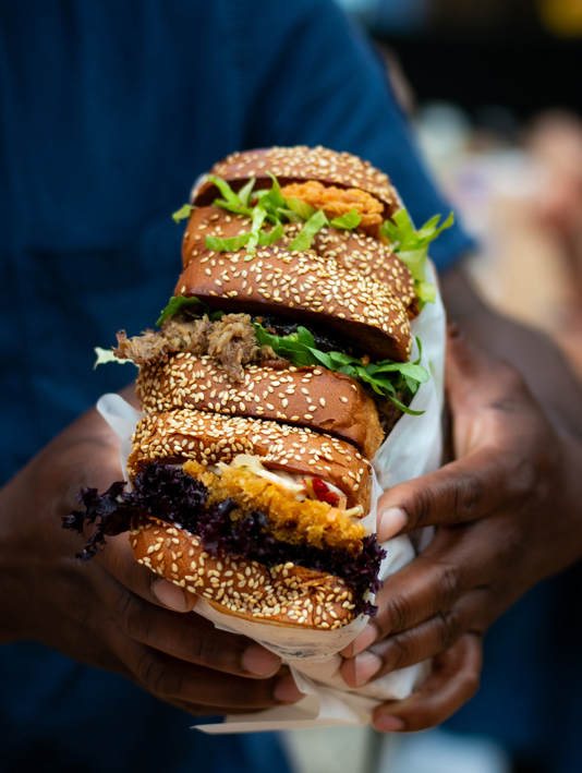 A juicy stacked sandwich by Crunch at The Kitchens in Old Spitalfields Market; succulents bites by Dumpling Shack, also at The Kitchens