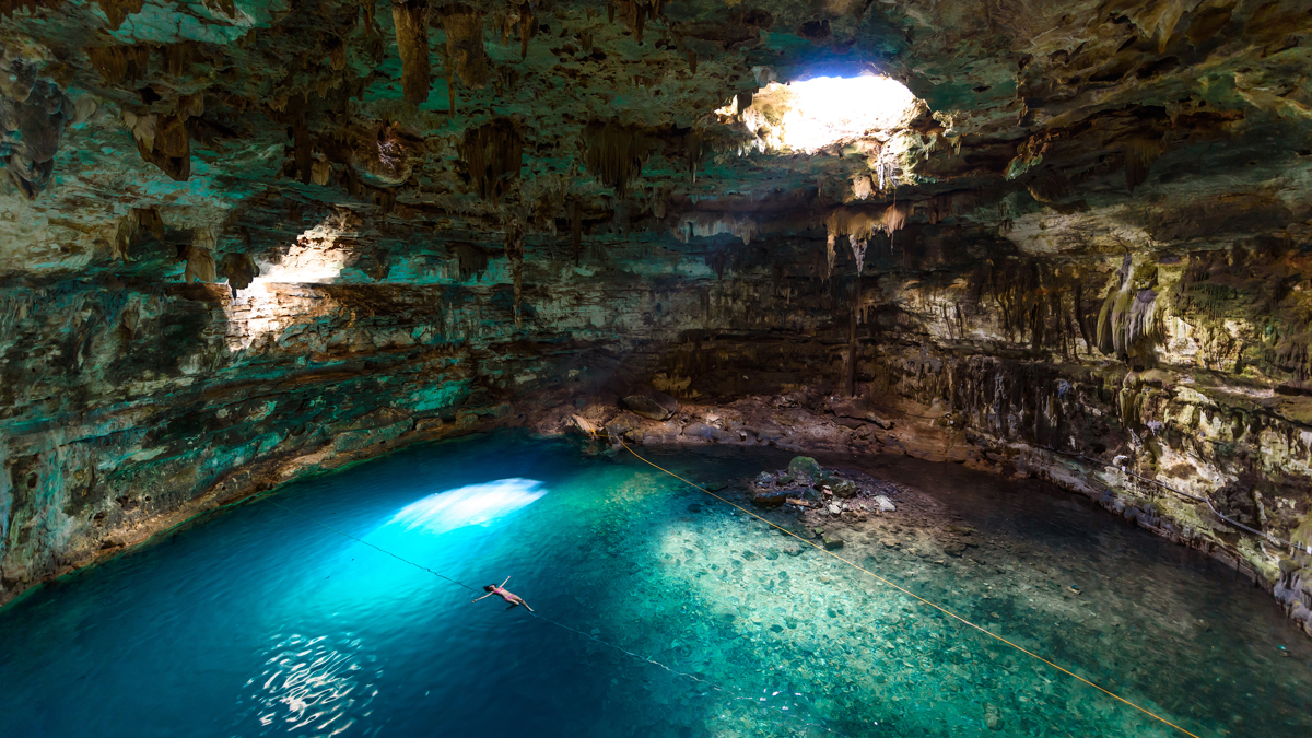 Around 66 million years ago, a meteorite crashed into the Yucatán Peninsula. The impact – which ultimately triggered the extinction of the dinosaurs – shattered the limestone bedrock, creating thousands of caves and sinkholes that filled with freshwater and became known as cenotes. Considered sacred by the ancient Mayans, many are now used as swimming pools. Cenote Samula is particularly dramatic: the base of the cavern is filled with crystal-clear, refreshingly cool water, while a hole in the roof allows a beam of sunlight and a tangle of gnarled vines to enter.