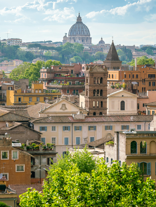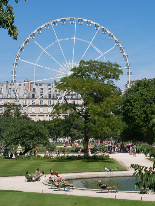 A Ferris wheel sits at the entrance of the Tuileries Gardens; view from the Orange Garden on Aventine Hill, Rome