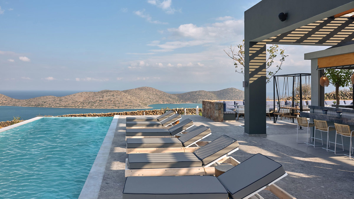 Cool Living Club private rooftop pool deck with Greco Levante restaurant at Domes Aulūs Elounda