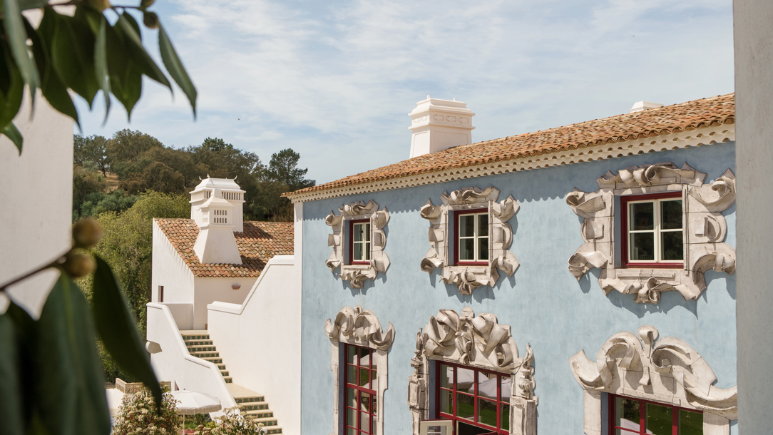 The sky-blue façade of Vermelho Melides Hotel adorned with ceramics by sculptor Giuseppe Ducrot
