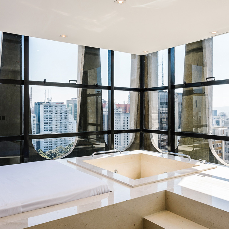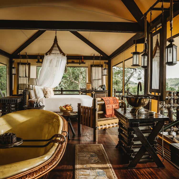 Four Seasons Tense Camp Golden Triangle, ThailandNestled in the rainforest of Chiang Rai, the tents at this ultra-luxe Four Seasons take glamping to new heights. Adorned with bespoke furnishings made from natural materials, the 54sqm tent comes with a sumptuous king-size bed, an outdoor rain shower and an alfresco deck where a custom-made hot tub overlooks the mountains of Laos, the Ruak River in Burma and the jungle that binds the two.Book a stayTivoli Mofarrej, São PauloLocated 22 floors up, the Presidential Suite at this inner-city hotel offers stunning vistas of downtown São Paulo, framed dramatically by concrete reinforcements on the building’s exterior. While the room is a picture of serenity featuring cream linens, warm woody tones and sultry lighting, the bathroom is fabulous, decked out in gleaming marble with a tub next to the windows so you can luxuriate while admiring the skyline.Book a stay