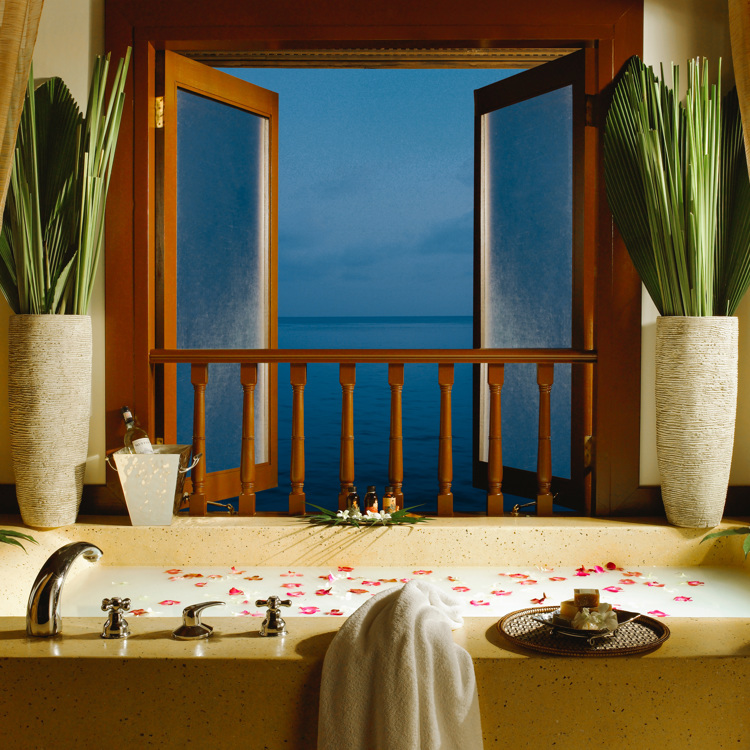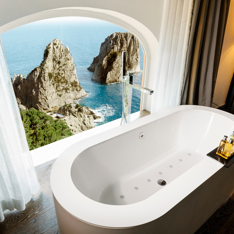 Punta Tragara hotel in CapriDesigned by Le Corbusier, this incredible Capresian property has hosted the likes of President Eisenhower and Winston Churchill, and no two rooms are the same. The Art Suite at Punta Tragara is filled with quirky design notes such as an enormous gilded mirror, warped lamp stands by Promemoria and a free-standing tub facing astonishing views of the Faraglioni rocks and sapphire waters below.Book a stayFairmont Sirru Fen Fushi, the MaldivesThe USP of this bucket-list hotel is undoubtedly the view from its Water Sunrise villas, where guests wake to cobalt skies and gin-clear waters. Alongside butler service, the villas come with a private plunge pool, wine fridge, Bang & Olufsen music system and, in the bathroom, an over-sized copper bath tub with infinity views of the open sea.Book a stay Mandarin Oriental, New YorkOverlooking Central Park and the Hudson River, the Oriental suite on this luxury stalwart’s 52nd floor is a vision of blue, cream and silver, fitted with a custom designed kitchen unit and a living room with Brazilian Cherry hardwood floors and handcrafted oriental rugs. Coated in sleek black marble, the bathroom looks out on the Big Apple’s iconic cityscape, allowing guests to soak in style while admiring the verdant park below.Book a staySouthern Ocean Lodge, Kangaroo IslandFor nature-lovers looking for a true back-to-nature hideaway, this remote resort ticks all boxes. Check into the Osprey Pavilion suite where décor includes a sleek sunken lounge, elegant furnishings and mesmerising views of the coastal wilderness. In the bathroom, enjoy the heated limestone floors before soaking in the hand-sculpted granite bath.Book a stayFour Seasons Tense Camp Golden Triangle, ThailandNestled in the rainforest of Chiang Rai, the tents at this ultra-luxe Four Seasons take glamping to new heights. Adorned with bespoke furnishings made from natural materials, the 54sqm tent comes with a sumptuous king-size bed, an outdoor rain shower and an alfresco deck where a custom-made hot tub overlooks the mountains of Laos, the Ruak River in Burma and the jungle that binds the two.Book a stayTivoli Mofarrej, São PauloLocated 22 floors up, the Presidential Suite at this inner-city hotel offers stunning vistas of downtown São Paulo, framed dramatically by concrete reinforcements on the building’s exterior. While the room is a picture of serenity featuring cream linens, warm woody tones and sultry lighting, the bathroom is fabulous, decked out in gleaming marble with a tub next to the windows so you can luxuriate while admiring the skyline.Book a stay Atlantis, The Palm, DubaiWith a total of 1,539 rooms, this mega resort’s two underwater suites look out on to the largest open-air aquarium in the Middle East and Africa, home to more than 65,000 marine animals. Floor-to-ceiling windows line each suite’s lounge, bedroom and bathroom, where guests can bathe with toiletries by La Ric before wrapping themselves in bathrobes from French linen brand D Porthault.Book a stayPangkor Laut Resort, MalaysiaSet on Pangkor Laut island on Malaysia’s western coast, this sprawling complex is built on the jungle’s fringes, where long-tailed macaques roam and oriental pied hornbills soar overhead. Here, the Spa Villas sit on stilts on the water, each with an oversized tub set next to a seafront balcony where guests can reinvigorate with calming views of the Strait of Malacca.Book a stay
