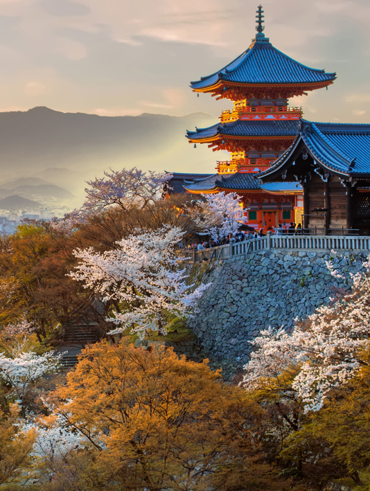 Katana Fizz made with Toku Saké, umeshu liqueur and San Pellegrino Tangerine & Strawberry; Kiyomizudera Temple in Kyoto
