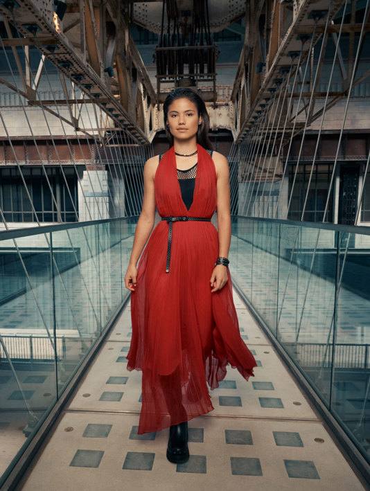 There’s a gasp from behind the laptop: “Look at that colour!” Britain’s number one tennis player is critiquing her look on the monitor: a quilted, ankle-length Dior coat and heavy-duty boots. We’ve just begun our photoshoot in the control room of one of London’s most iconic buildings – Battersea Power Station – and Emma Raducanu has taken to it with the aplomb you’d think she’d reserve for her Grand Slam-winning on-court performances. Amid thick industrial lines and angular Art Deco reliefs, she’s a buoyant but focused presence, spontaneously popping peace signs at the camera.
