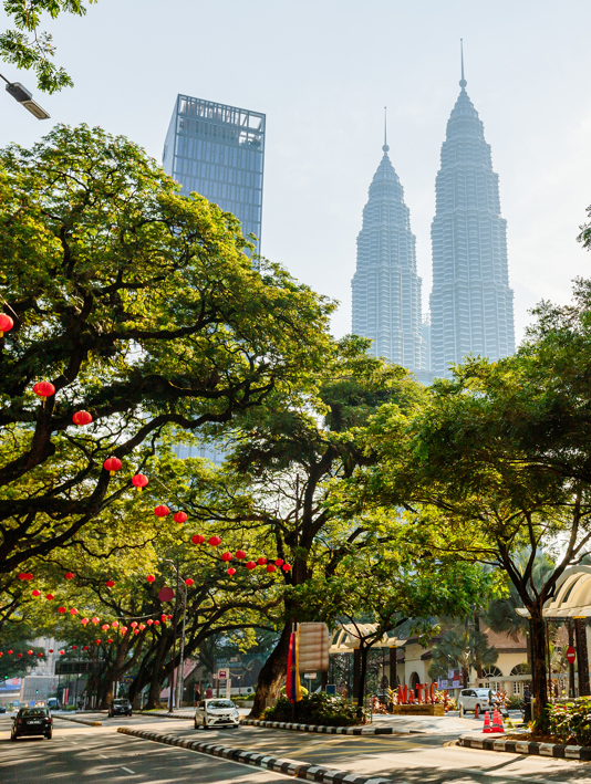 The Petronas Towers loom over Kuala Lumpur; a Malaysian tea plantation
