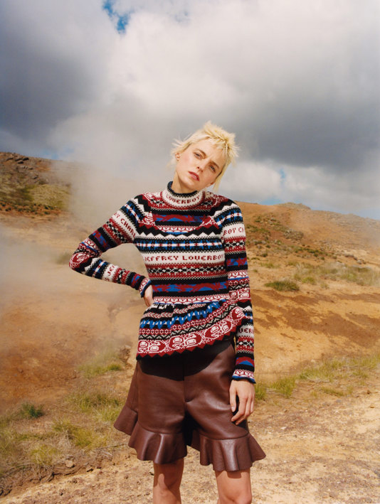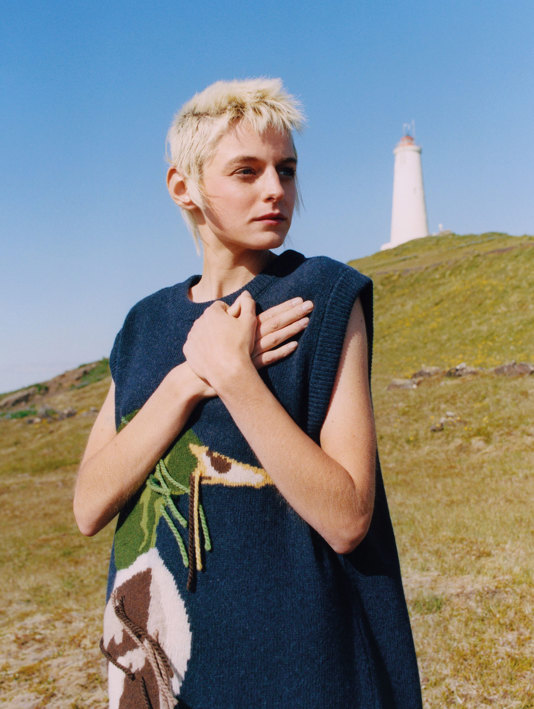 Left: Corrin wears Miu Miu cashmere jumper; Elliss mesh mini dress; Falke Brenda tights; Miu Miu x Church’s shoes. Right: SS Daley Duck lambswool vest. Below: JW Anderson Sham Man jumper