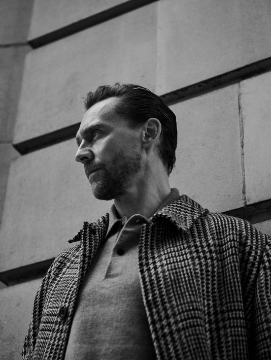 Hiddleston wears Sunspel grey Shetland wool knit, £176; Giorgio Armani herringbone wool coat, £3,850. Opening image: Richard James Hepworth suit, £1,490, and navy knit polo shirt, £120